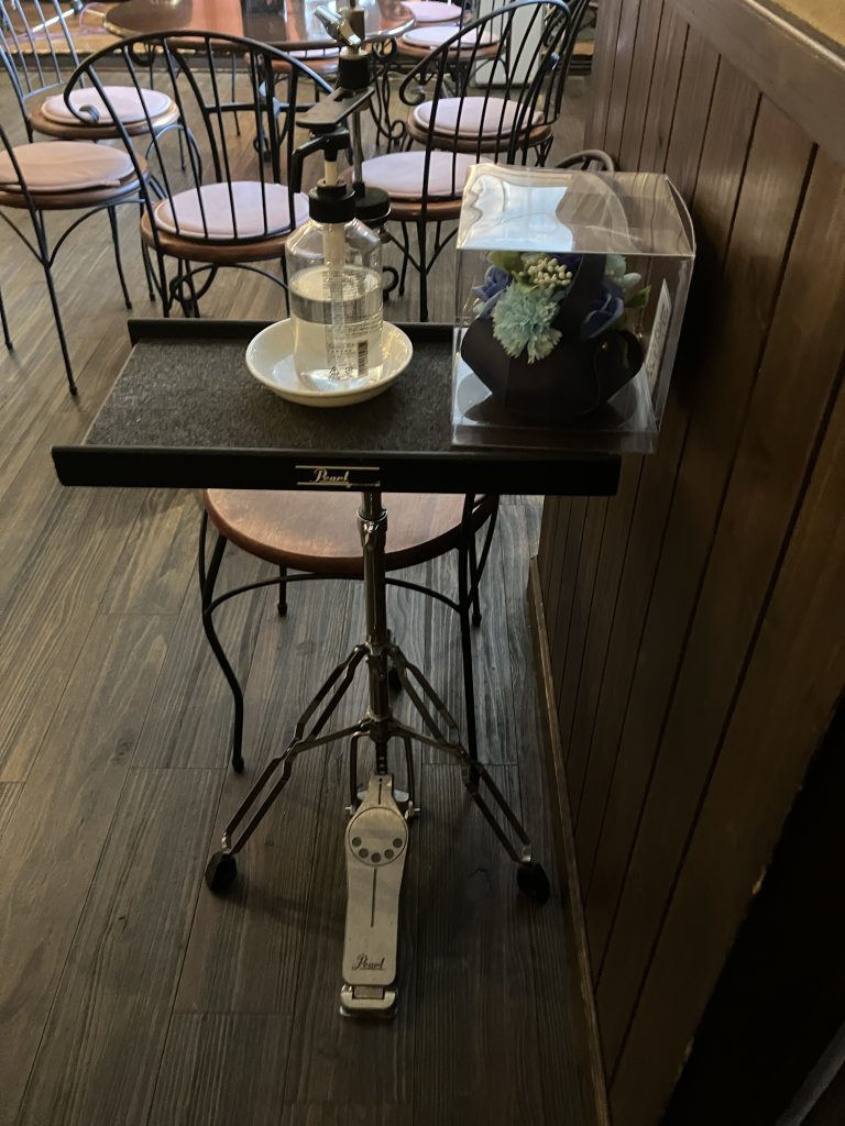 コロナ禍で発売された、Pearl製のハイハットスタンドを応用した消毒液スタンド