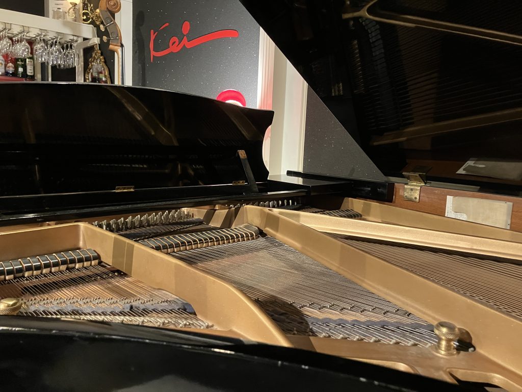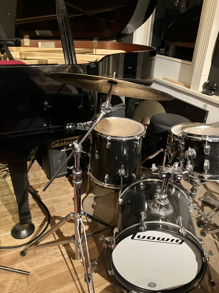 ドラムセットはピアノの真横なので、ピアノの中がよく見えます。