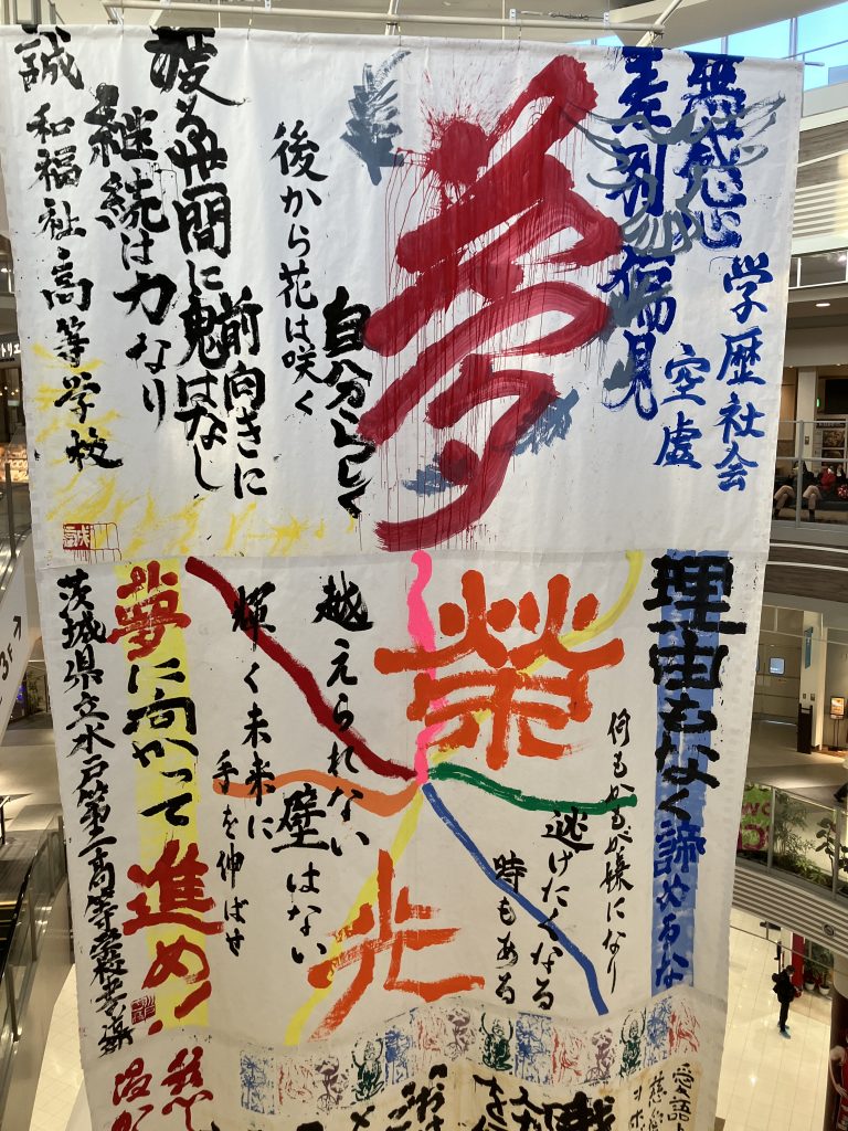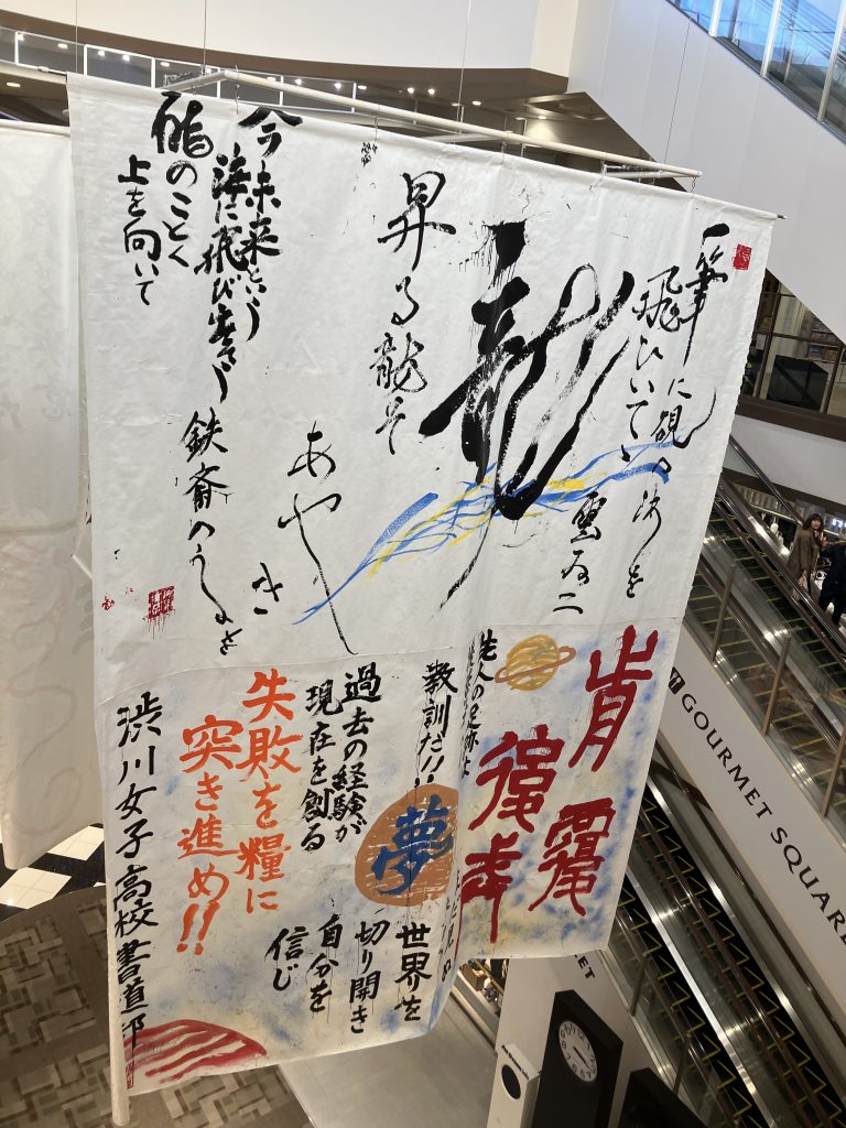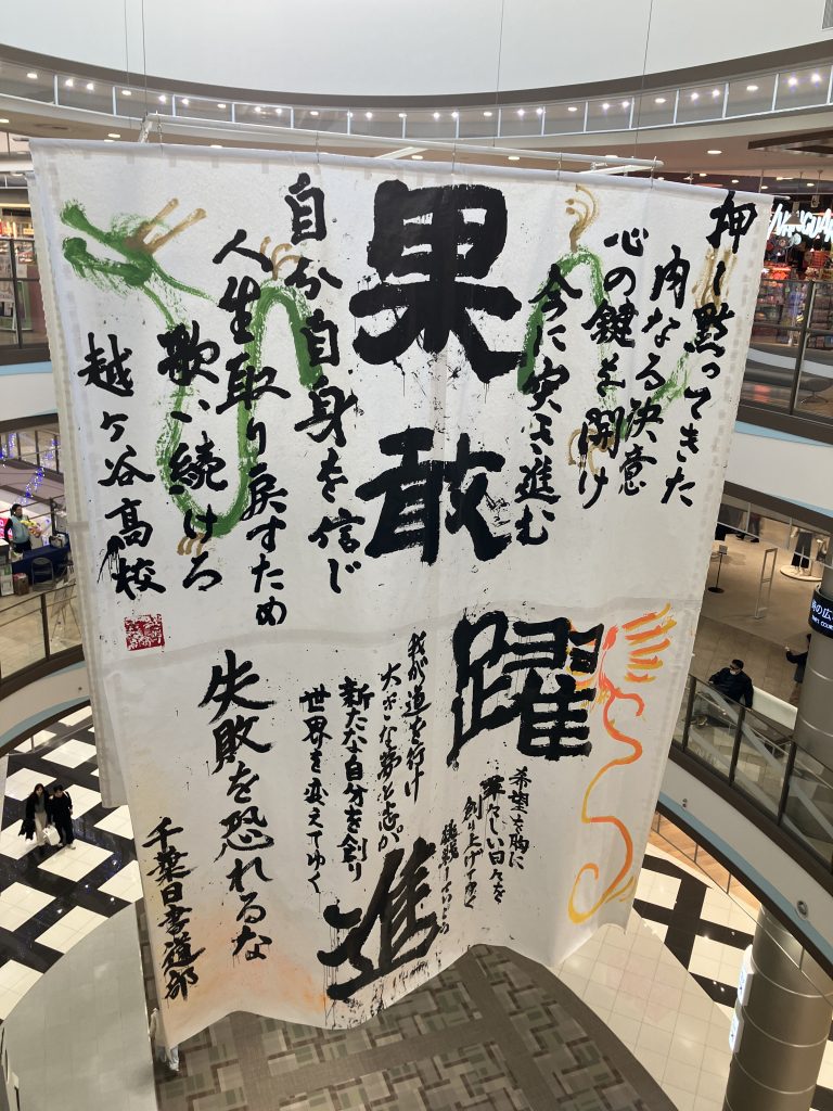 書道パフォーマンスの書き初めがあちこちに展示されていました。