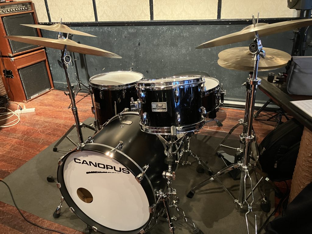楽器はバスドラム、スネア、シンバルを持ち込みました。お店のドラムセットと同じ黒色ですので、違和感無いですよね?