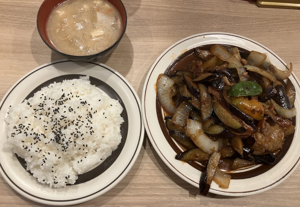 夜ご飯は近くの洋包丁で茄子と肉のしょうが焼き