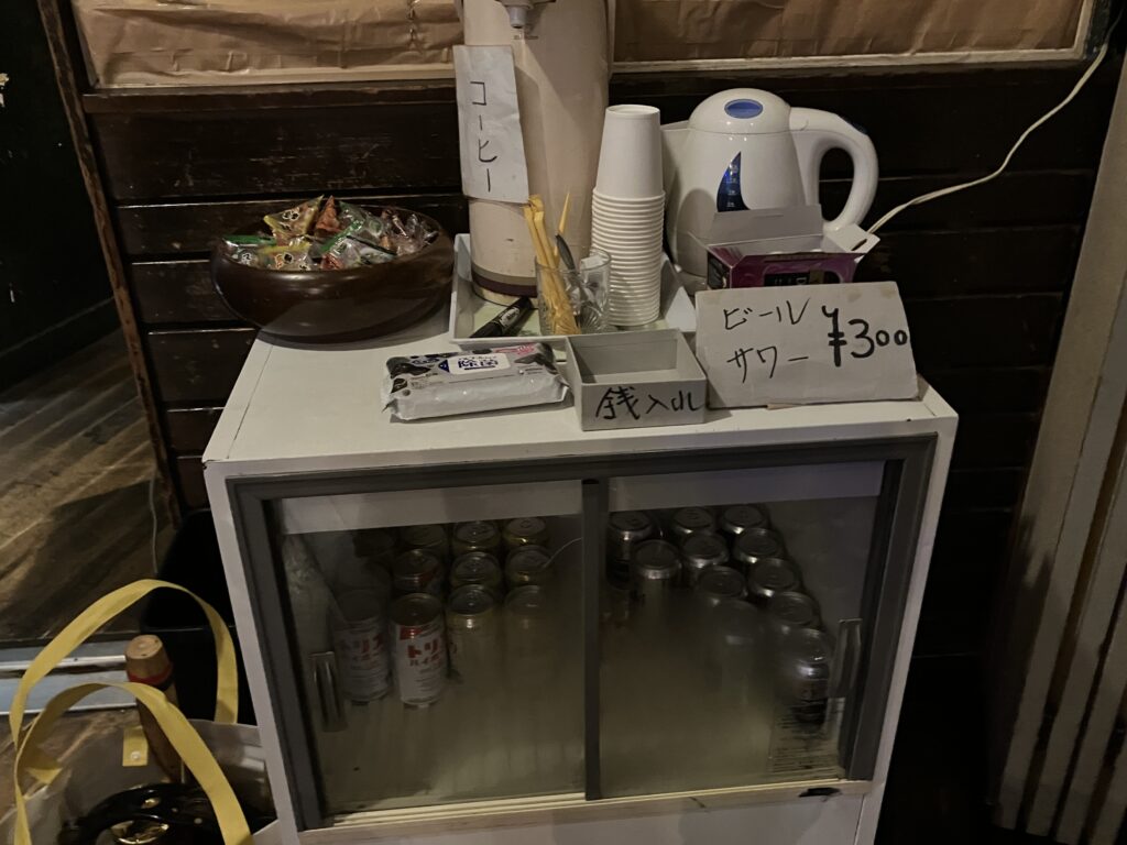 コーヒー、紅茶、お菓子は無料でビール、サワーは300円です。(持ち込み自由)