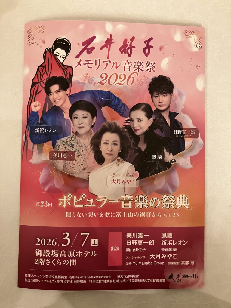 今日は1年ぶりの石井好子メモリアル音楽祭で、御殿場高原ホテルへ来ています♪