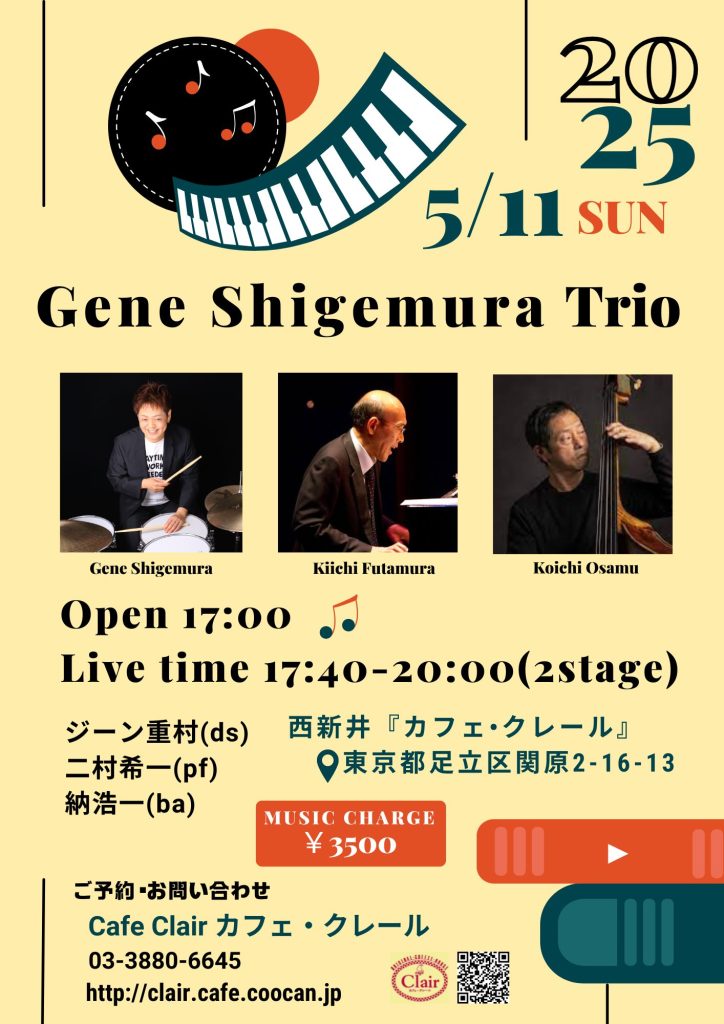 ここカフェクレールで5/11にジーン重村Trioのライブがあります。